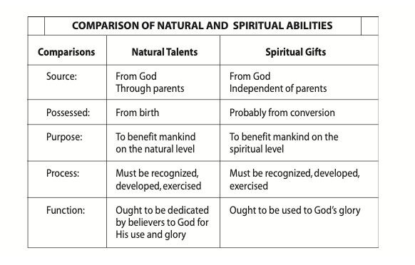 It should also be noted what is not meant by spiritual gifts.[2] It does not mean a place of service. Some may suggest, “He has a real gift for working in the slums.” This, of course, is a wrong concept of spiritual gifts. Nor is a spiritual gift an age group ministry. Or some might say that “he has a real gift for working with senior highs.” A spiritual gift is not the same as a natural talent; there may be a relationship, but a natural talent is an ability that a person may have from birth and develop, whereas a spiritual gift is given supernaturally by God at the moment of conversion. Natural talents and gifts may be contrasted thus:[3]