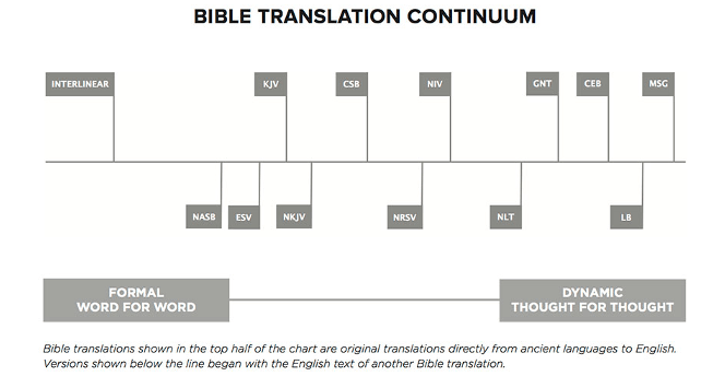 As demonstrated by the chart above, some translations closer to the formal equivalence end of the spectrum include the New American Standard Bible (NASB) and the English Standard Version (ESV).